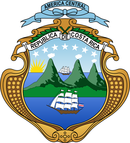 哥斯达黎加共和国国徽启用于1848年,1998年5月5日进行了部分修改。国徽顶端飘扬着一条写着“中美洲”的蓝带,表达出哥斯达黎加人对原有联邦的缅怀;下方是镶有绿色枝叶的写有 共和国国名的白色饰带。国徽两侧的玉米粒,圆润而金黄,说明这个高原国家的农业以玉米种植为主。3座红褐色的火山峰表示太 平洋和加勒比海之间的巴尔巴、伊拉苏和波阿斯山,山坡下繁花似锦的绿色高原上,居住着哥斯达黎加以生产咖啡为主的四分之三的人口。蓝天上7颗白色五角星代表哥斯达黎加现有的7个省。近景的加勒比海和山后的太平洋海面各有一艘古老的白色帆船,航行的动感将哥斯达黎加繁荣的海上贸易跃然托出。一轮朝阳在海面冉冉升起,新世纪的曙光照耀着这个国家的光明前程。