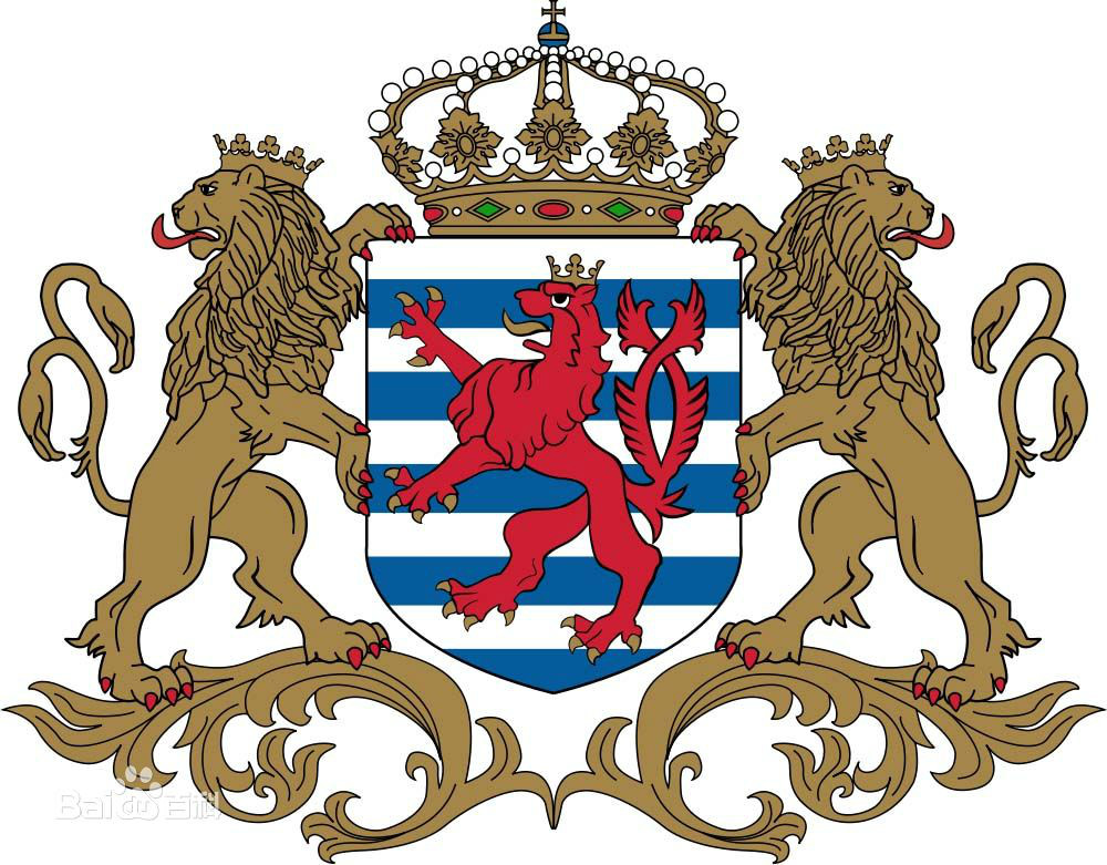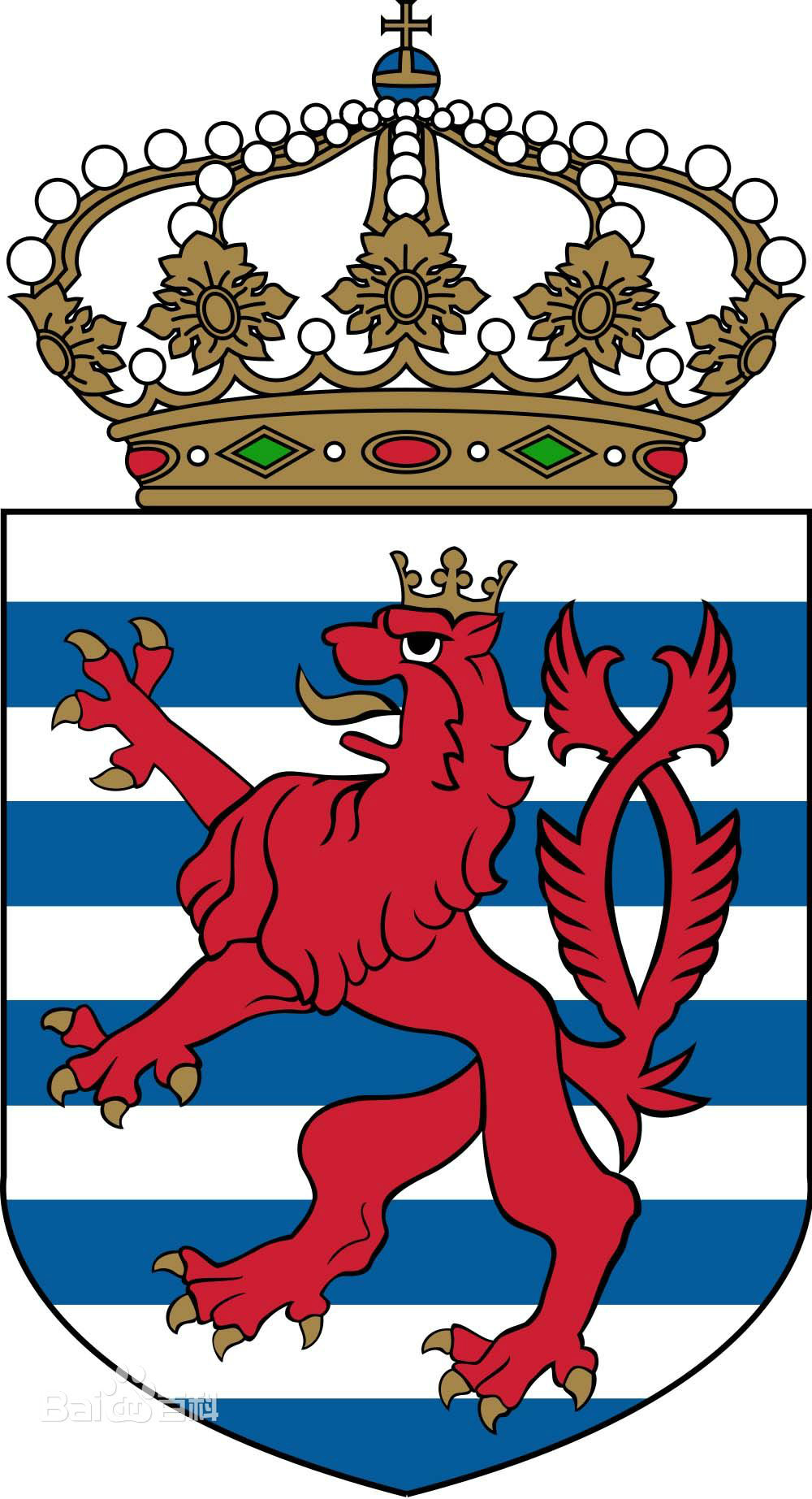 卢森堡大公国国徽分为大中小三种,小国徽中心图案为一盾徽,绘有白蓝相间的十条横条,中间为一只头戴金冠、呈忿怒状的红色狮子。上有大公冠冕。中国徽有两只狮子守护盾徽。大国徽为中国徽加上斗蓬,上方有大公冠,下饰勋章。在顶部有一金色王冠的金、红、白三色斗篷内,有一枚盾徽。盾面由白、蓝相间的平行条纹组成,其上绘有一只头戴王冠的直立着的红狮,红、白、蓝三色为国旗颜色。盾徽上方有一顶公爵金冠,两侧各有一只金狮,周围饰有绶带,下端悬垂着一枚奥康勋章。国徽图案象征卢森堡是一个大公国。