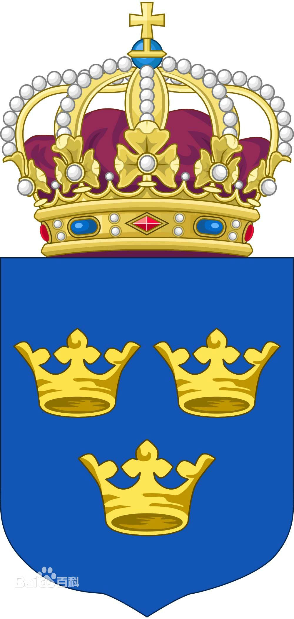 瑞典王国国徽分为大小两种。小国徽为瑞典政府使用。大国徽为王徽。小国徽称为三王冠,为蓝地的盾徽,上绘三面三垛的金冠,上有瑞典的王冠。大国徽为斗篷式,一面绘有国旗图案的盾徽配置在华美高贵的大帐篷里。图案带有不少中世纪时代的色彩。饰有王冠的蓝盾被黄十字一分为四:左上和右下部绘有三顶王冠;自1364年以来,瑞典王国就以此作为国家的标志,它代表着至今仍保留的君主体制;右上和左下部绘有戴着王冠的金狮。它象征古老的福尔孔王朝。国徽图案中心镶嵌着一枚小国徽图案:红底银色宽带上托着一把金壶;一只金色雄鹰飞翔在星光灿烂的夜空中;蓝天下,一座银白色双塔城堡巍然矗立。它们分别代表了瓦萨王朝及其继承人伯纳道家族。盾徽两侧侍立着一头戴着金色王冠的雄狮,顶部的皇家冠冕由六翼天使勋章的链条环绕,链条上装饰着生动的天使形象。
