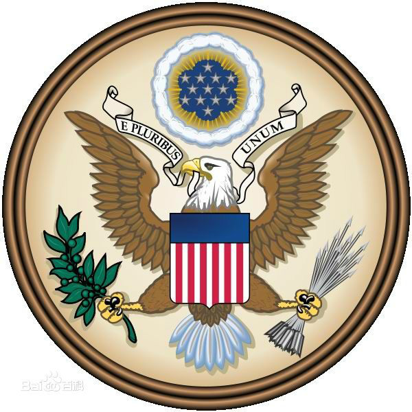 美利坚合众国国徽实际上是美国官方大纹章上的图案。印章存在美国国务院,第一次用于1782年。事实上,美国并未指定一个国徽图案。但纹章正面的图像实际上已经成为美国的象征,且经常出现在官方文件上,如护照。最常使用的是彩色版本国徽图案;而真正印章在纸张上盖下的图案是单色的。正面国徽正面图案的主要形象是象征美国的白头海雕,白头海雕是力量、勇气、自由和不朽的象征。白头海雕的双翅展开(纹章学里称为“展现”)。左右鹰爪分别抓着象征和平和武力的橄榄枝和箭。鹰头目视左方,象征着期望和平。鹰嘴叼着的绶带上写着拉丁文格言“合众为一”(E Pluribus Unum)。鹰头上方的象征着拥有主权的新生国家“光环”的蓝色背景里镶着象征美国最初13个州的13颗五角星。鹰胸前有一个没有支撑物的盾,使人混淆的是此盾有两个主要与美国国旗的不同之处:其一是上方的蓝色部分内没有星(虽然其他的一些纹章上有;代表美国国会的纹章上就有13颗星,9·11委员会使用的纹章蓝色部分则有50个有孔的星),其二是不像国旗那样,下放的红白条纹最外面的是白色条纹,而非红色条纹。整个纹章经常被描述为以蓝色为底色,等分为13个条,白红相间。这个描述技术上是不准确的,因为盾型是不可被垂直等分奇数份;其他类似错误的描述有:用红色在白色底上等分六条……。但所有这些描述都指出那条纹代表的是美洲最初的十三个原始殖民地。